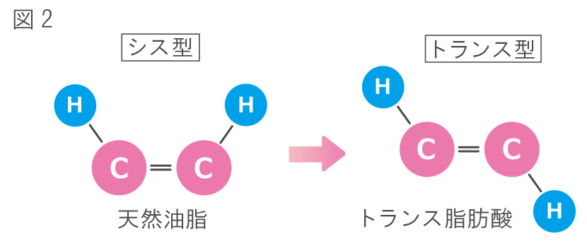こうして作られる安いサラダ油には、製造過程でトランス脂肪酸が大量に含まれてきます。トランス脂肪酸は、悪玉コレステロールを増やし、善玉コレステロールを減らす、まさに「動脈硬化の原因」となるものです。牛や羊など反芻動物の肉に微量に含まれる以外、自然界には本来存在しません。ところが、サラダ油の製造過程で何度も高温処理するうちに、油の構造が図2のように天然のシス型からトランス型へと変わってしまうのです。