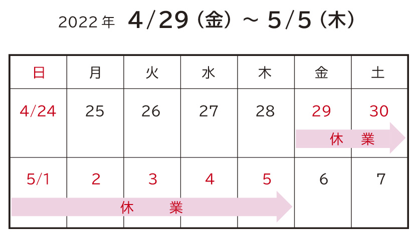 誠に勝手ながら、下記の期間を休業とさせていただきます。 ご不便をおかけしますが、何卒ご了承の程よろしくお願い申し上げます。5/6(金)より平常通りの営業となります。