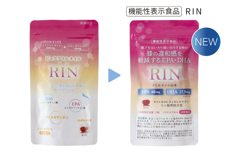 1日3粒で膝の違和感を軽減する機能を持つ『機能性表示食品 RIN』は、スムーズな毎日をサポートする商品となります。商品改定に伴い商品パッケージの変更がございますが、内容成分、内容量に変更はございません。また、価格に関しても据え置きとさせていただきます。引き続きご愛顧賜りますよう、お願い申し上げます。